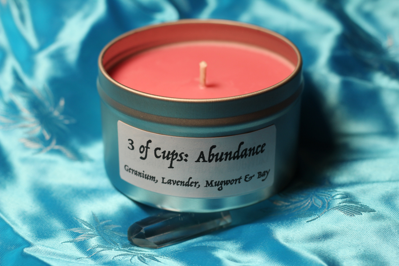This candle is formulated to the 3 of Cups in the Tarot, and the portion of the Zodiacal Sign of Cancer which is ruled by the planets Mercury and Mars. The name of this card is the Lord of Abundance. The color is a delicate, rich pink and it gives off the inebriating scent of Geranium, Lavender, Mugwort & Bay. From Liber T (1888):